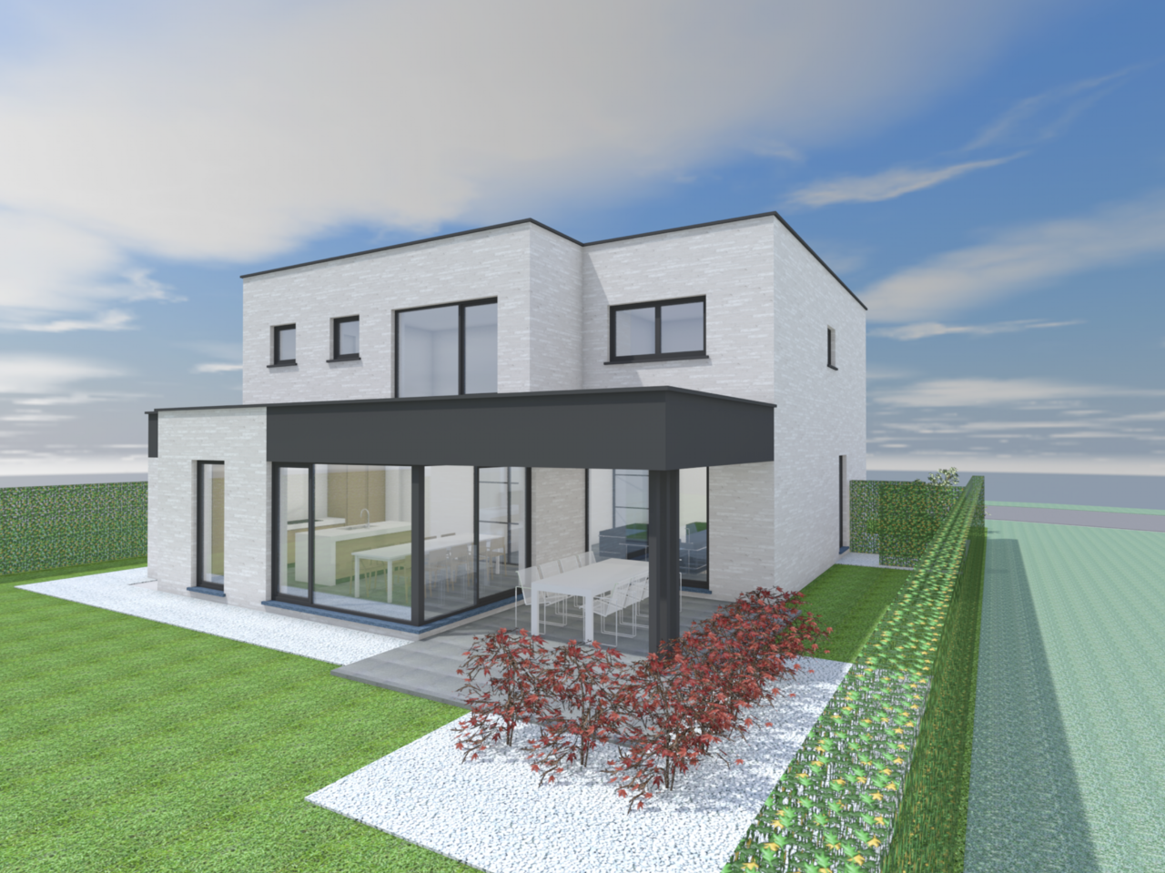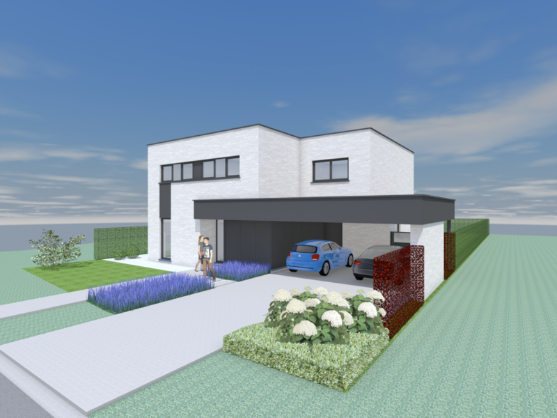Deze moderne woning met een plat dak en dubbele carport werd eerst ontworpen in een gevelsteen en een vlakke beplating. Uiteindelijk zal deze volledig in witte crepi uitgevoerd worden.